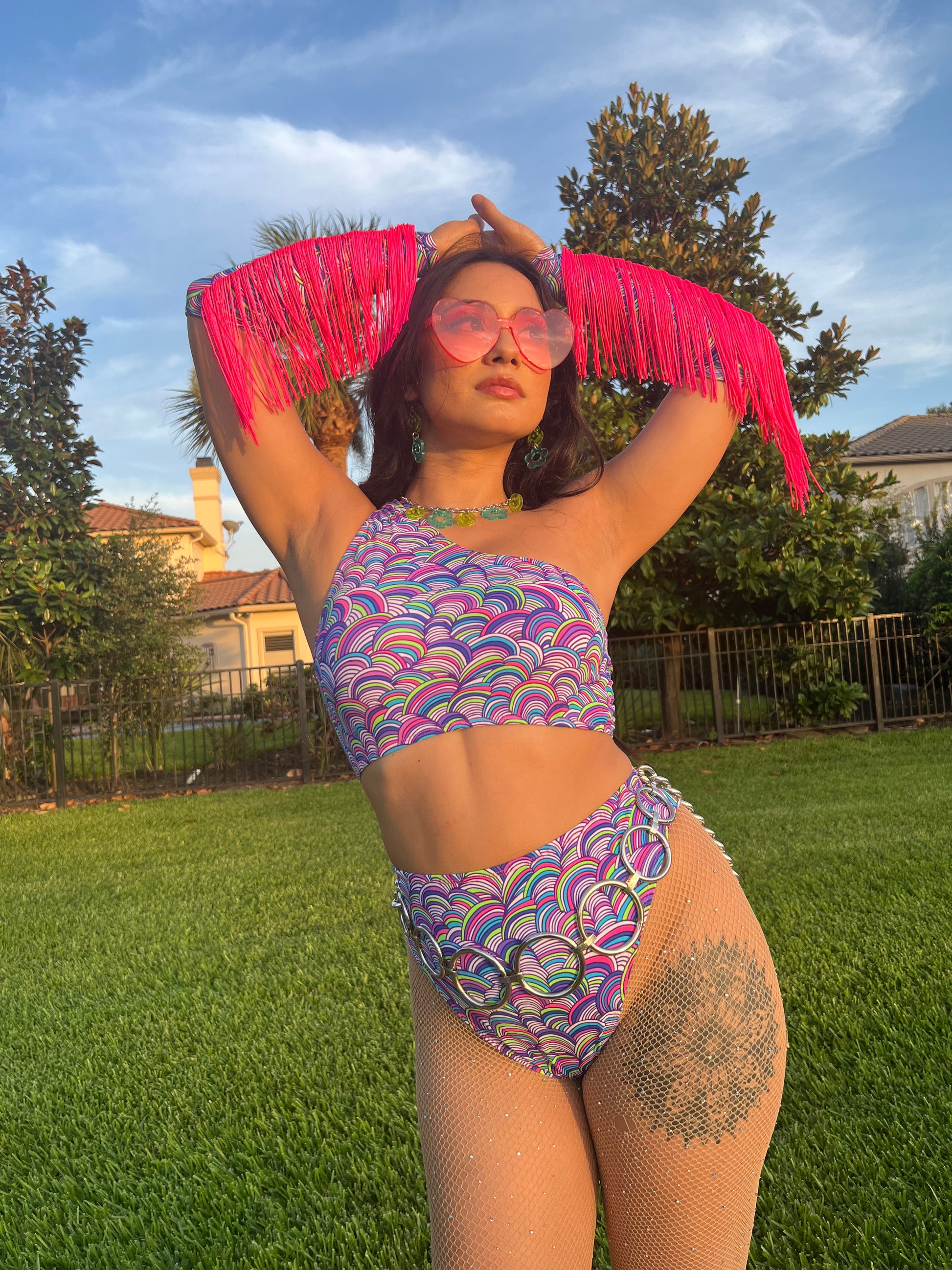 Bring some much-needed sweetness into your wardrobe with this Candy Crush Fringe Top. With its groovy colorful swirly pattern and soft spandex material, this groovy top is guaranteed to cause some crushes! The one shoulder tank is extremely supportive and has secure elastic hems. This listing comes with the top only.
